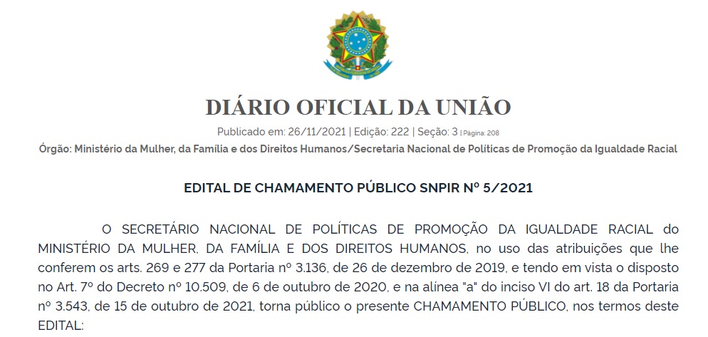 Gestores municipais que desejam melhorar estruturas e equipamentos físicos de espaços que promovam a promoção da igualdade racial podem solicitar, até o dia 31 de janeiro, adesão por meio de edital de chamamento público da Secretaria Nacional de Políticas de Promoção da Igualdade Racial no âmbito do Programa de Equipagem e Modernização da Infraestrutura dos Órgãos. O valor total estimado da doação por participante será de R$ 164 mil.