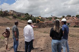 O secretário municipal de Infraestrutura, engenheiro Roany Izidoro, as arquitetas Larissa Cajueiro e Katiane Duarte, os engenheiros Luélvio, Felipe, e o representante do bairro, o morador Iclécio Santos, também estiveram no local onde será construída uma das mais importantes obras de impacto social da história de Arapiraca.