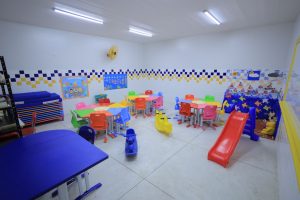 Os serviços realizados pela Secretaria de Infraestrutura também incluíram a construção de um pátio coberto com refeitório, ampliação da cozinha, nova fachada, novos banheiros e a construção de um pátio coberto para atividades motoras.