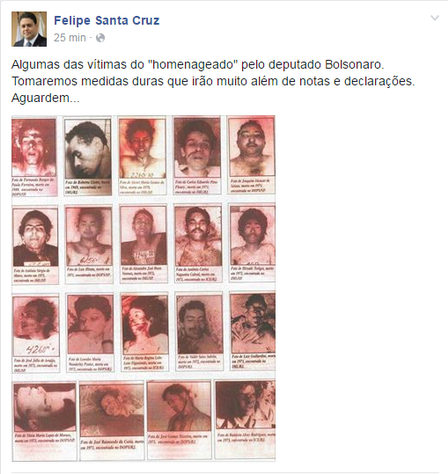 Anunciando que tomaria providências contra Bolsonaro, o presidente da ordem postou em seu Facebook imagens com 20 pessoas que teriam sido torturadas por Ustra. “Algumas das vítimas do “homenageado” pelo deputado Bolsonaro. Tomaremos medidas duras que irão muito além de notas e declarações”, escreveu.
