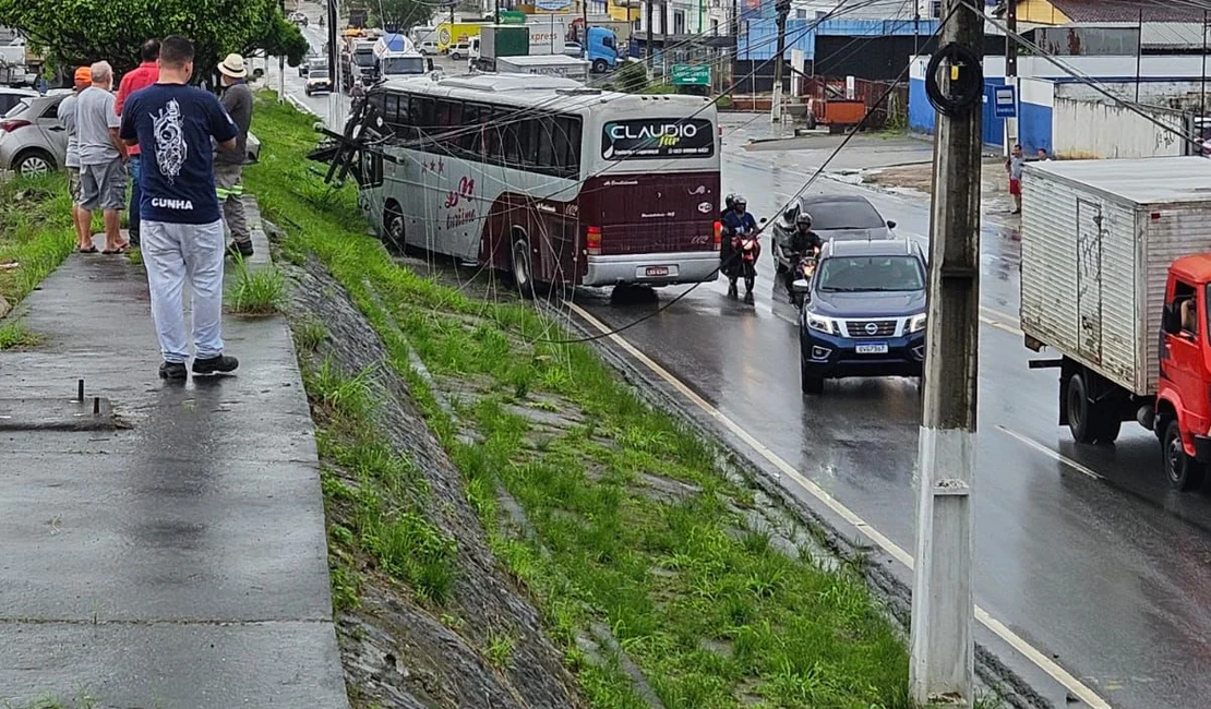 Imagens capturadas por populares mostram claramente o momento em que o ônibus perdeu o controle e atravessou a via na contramão, atingindo o poste de frente. O impacto foi tão forte que o poste não resistiu e acabou tombando no acostamento da pista. A rápida ação dos agentes de trânsito e da Equatorial Alagoas foi fundamental para garantir a segurança no local.