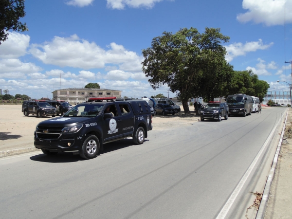 A operação deste sábado mobilizou policiais penais do Grupo de Remoção e Intervenção Tática (Gerit) do sistema prisional, além de militares do Batalhão de Operações Policiais Especiais (Bope) e do Grupamento Aéreo da Secretaria de Segurança Pública.