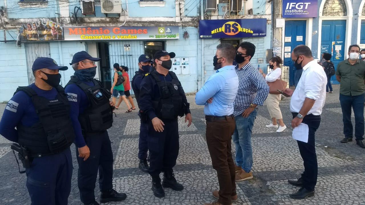 Após receber pedidos de moradores, o secretário Thiago Prado, junto com a equipe de Convívio Social da Secretaria Municipal de Segurança Comunitária e Convívio Social (Semscs), e a Guarda Municipal, realizou uma visita técnica ao calçadão do comércio, nessa quinta-feira (25). A visita contou com a presença de representantes da Aliança Comercial e teve como objetivo detectar os problemas existentes e apontar possíveis soluções.
