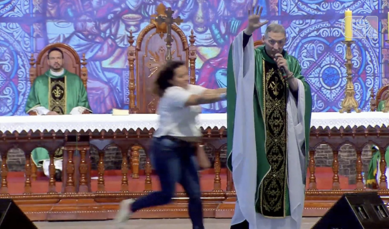 Mais de 50.000 pessoas estavam na celebração de encerramento do acampamento ‘Por Hoje Não’ e presenciaram a cena. O padre, que afirmou não estar ferido, retornou ao palco momentos depois.