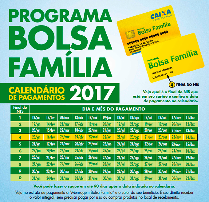 O beneficiário pode acompanhar o calendário de pagamentos do ano de 2017. Há outros meios de acessar as datas de pagamento do benefício, através do telefone (82) 3315-3686, para os beneficiários de Maceió. No número 0800 707 2003, da Central de Relacionamento do Ministério do Desenvolvimento Social e Agrário (MDSA), o beneficiário de todo o País também tem acesso às informações sobre o pagamento do Bolsa Família.