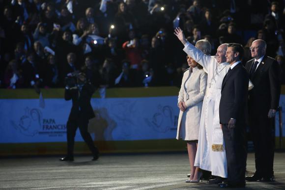 O presidente Enrique Peña Nieto deu as boas-vindas a Francisco no aeroporto, enquanto uma banda mariachi tocava. O papa subiu então para opapamóvel, de onde acenou à multidão na capital do segundo maior país católico do mundo.