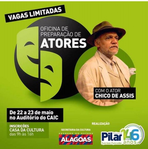 Com o intuito de levar as práticas do teatro para o interior de Alagoas, a Secretaria de Estado da Cultura (Secult) realiza nesta terça-feira (22), no auditório do CAIC, localizado no Centro de Pilar, a Oficina de Preparação de Atores. Estão sendo disponibilizadas 30 vagas para com direito a certificado de participação. As inscrições são gratuitas e as vagas são limitadas.