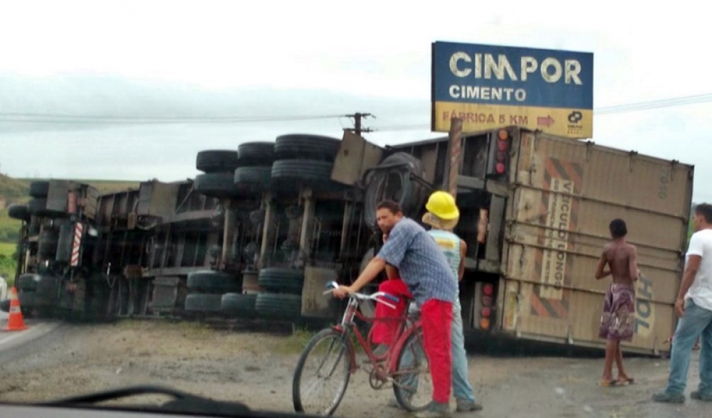 Uma carreta Scania, de modelo e placa não divulgado, tombou, na tarde deste sábado, dia 02, na altura do km 134 da rodovia federal BR 101, em São Miguel dos Campos.