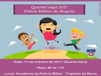 A Polícia Militar de Alagoas vai realizar na próxima quarta-feira (11), a sexta edição do projeto “Quartel Legal”, em comemoração ao Dia das Crianças, celebrado oficialmente no dia 12 de Outubro. O evento vai ocorrer das 08 às 11 horas, na Academia de Polícia Militar Senador Arnon de Mello, no bairro do Trapiche da Barra, em Maceió.