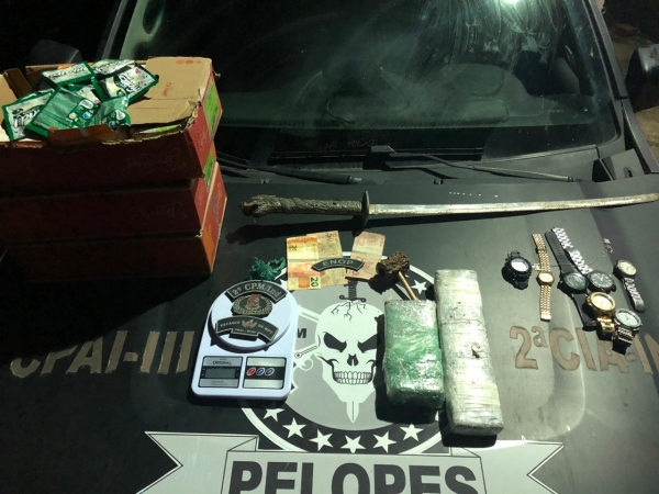 Na ação alguns indivíduos empreenderam fuga pelo matagal, porém três foram detidos. Com eles foram apreendidos um quilo de uma substância análoga a maconha, uma balança de precisão, uma espada, a quantia de R$ 80 reais em espécie, sete relógios e um cachimbo. Os envolvidos foram apresentados, junto do material, na Delegacia de Novo Lino para os procedimentos cabíveis.