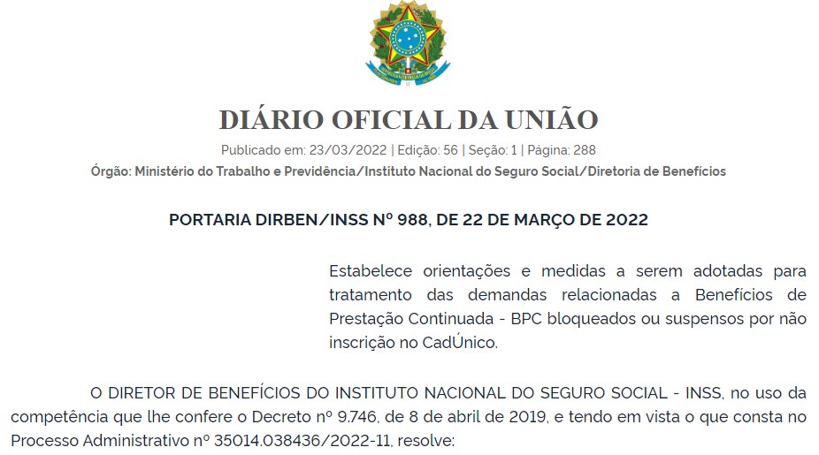 A tarefa Reativação de Benefícios de Prestação Continuada (BPC) após atualização do CadÚnico foi criada pela Portaria 1.022/2022 da Diretoria de Benefícios e Relacionamento com o Cidadão do Instituto Nacional do Seguro Social (Dirben/INSS). Publicada nesta quinta-feira, 2 de junho, a normativa estabelece orientações e medidas para tratamento das demandas relacionadas ao BPC bloqueado ou suspensos por não inscrição no CadÚnico.