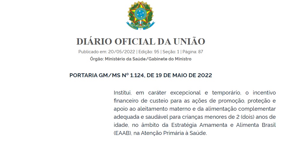 Os Municípios devem receber recursos para o incentivo financeiro de custeio para as ações de promoção, proteção e apoio ao aleitamento materno e da alimentação complementar adequada e saudável voltada às crianças menores de dois anos de idade. Publicada pelo Ministério da Saúde nesta sexta-feira, 20 de maio, os repasses previstos na Portaria 1.124/2022 são de caráter temporário e fazem parte da Estratégia Amamenta e Alimenta Brasil (EAAB), da Atenção Primária à Saúde.