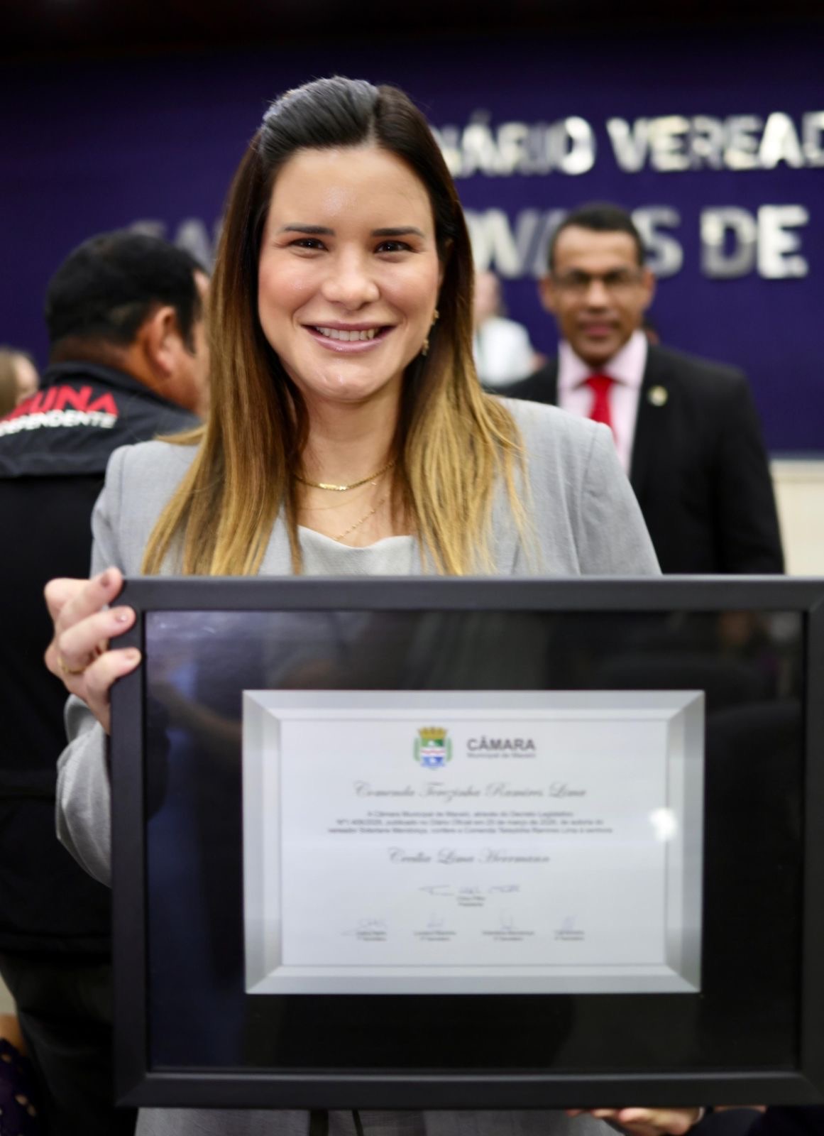 Durante a cerimônia, a prefeita Ceci recebeu a Comenda Terezinha Ramires Lima, uma honraria destinada a mulheres que se destacam por suas contribuições significativas à comunidade, em especial na luta pelos direitos das mulheres, saúde e educação. A proposta de entrega da comenda partiu do vereador Siderlane Mendonça, que reconheceu a importância da atuação de Ceci em prol da população feminina.