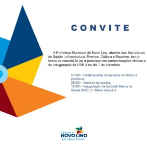 Em comemoração ao 7 de setembro, a prefeitura de Novo Lino realiza uma solenidade comemorativa que inclui a inauguração de uma Unidade Básica de Saúde (UBS) do tipo 3 Maria Joaquina. A solenidade está prevista para acontecer às 10 horas e terá a presença da prefeita Marcela Gomes, além de secretários municipais e outros convidados.