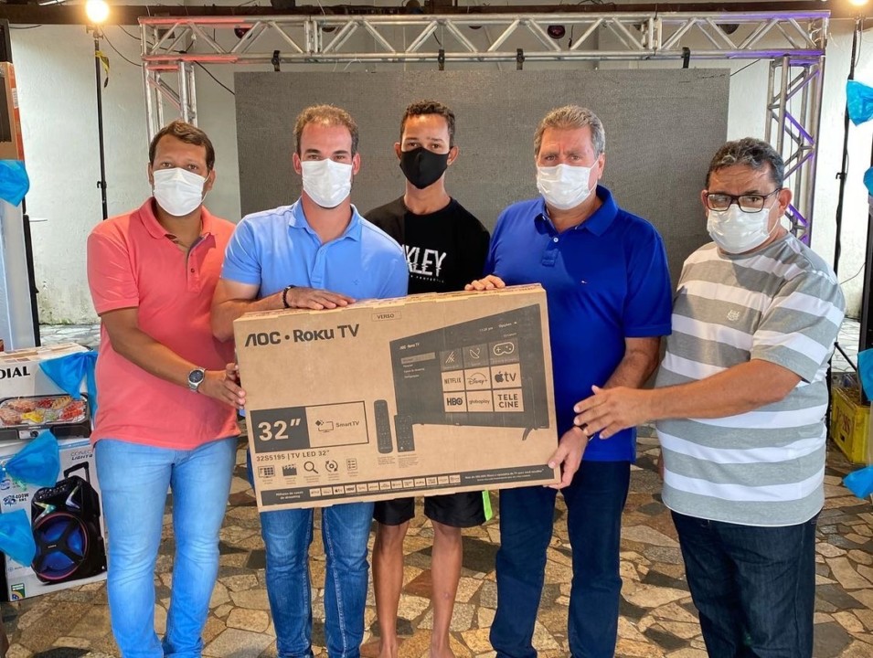 Ao lado do vice-prefeito Remi Filho, secretários municipais, vereadores e do ex. prefeito Remi Calheiros. Olavo Neto sorteou para os pais muricienses vários prêmios, entre eles; geladeiras, aparelhos de barbear, televisores, celulares e bicicletas.