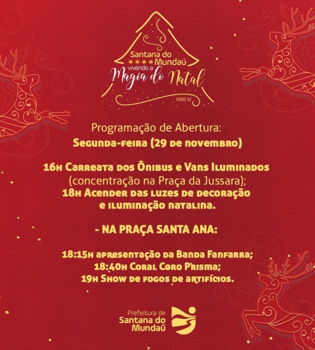Com a retomada gradual dos eventos, a prefeitura de Santana do Mundaú anuncia a programação da quinta edição do projeto “Vivendo a Magia do Natal”. A abertura que acontecerá na próxima segunda-feira (29), a partir das 16h, contará com uma linda carreata saindo do Residencial Jussara – sentido centro da cidade, com ônibus e vans que estarão iluminados especialmente para a ocasião. Às 18h, na Praça Santa Ana, as luzes da decoração e iluminação natalina serão acesas e o público poderá conferir a apresentação da Banda Fanfarra e do Coral Coro Prisma. A programação encerrará com um lindo show de fogos de artifícios.