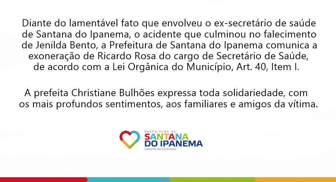 Diante do lamentável fato que envolveu o ex-secretário de saúde de Santana do Ipanema, o acidente que culminou no falecimento de Jenilda Bento, a Prefeitura de Santana do Ipanema comunica a exoneração de Ricardo Rosa do cargo de Secretário de Saúde, de acordo com a Lei Orgânica do Município, Art. 40, Item I.