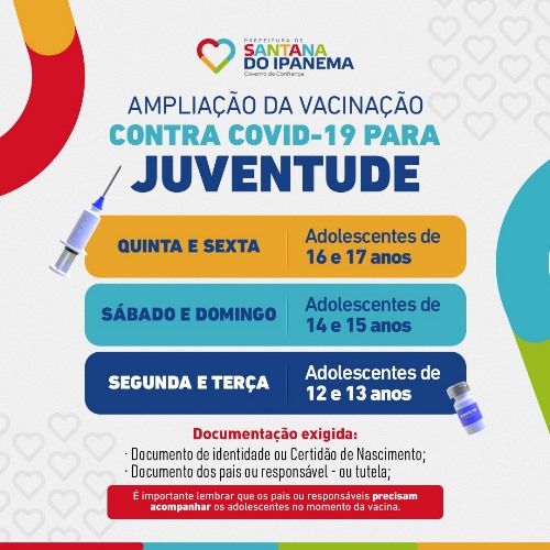 A prefeitura de Santana do Ipanema divulgou um cronograma de imunização contra Covid-19 dos adolescentes com idades entre 12 e 17 anos. A vacinação começa nesta quinta-feira (23). O imunizante aplicado neste público será exclusivamente o da Pfizer.
