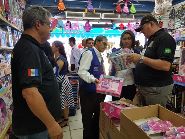 No total, 1.054 itens foram apreendidos pelas equipes, que foram divididas em duas e percorreram oito estabelecimentos de venda de brinquedos e produtos importados. Entre os itens apreendidos estão bonecas e bonecos falsificados, produtos sem o selo do Inmetro ou com o selo falsificado, além de produtos sem o aviso de fecho metálico, que é obrigatório.