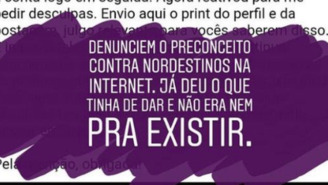 — Depois de pedir desculpas, ela me bloqueou e excluiu os outros perfis nas redes sociais — afirmou Camila. — Eu fico profundamente triste quando leio esse tipo de coisa. Sou uma pessoa que defende a cultura nordestina. É esperado que todo período eleitoral a gente ouça comentários assim, mas não podemos deixar essas piadinhas com nossos costumes para lá. A gente dá um duro tão grande, também construímos esse país. É muito chato ouvir que somos alienados. Nem acho que demitir resolva o problema, porque uma medida mais reparadora, como uma semana de trabalhos sobre a cultura nordestina, seria mais eficaz.