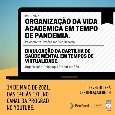 Organização da vida acadêmica em tempo de pandemia é o tema do Webinar gratuito que será transmitido nesta sexta, 14 de maio, das 14h às 17h, no canal da Pró-reitoria de Graduação no Youtube.
