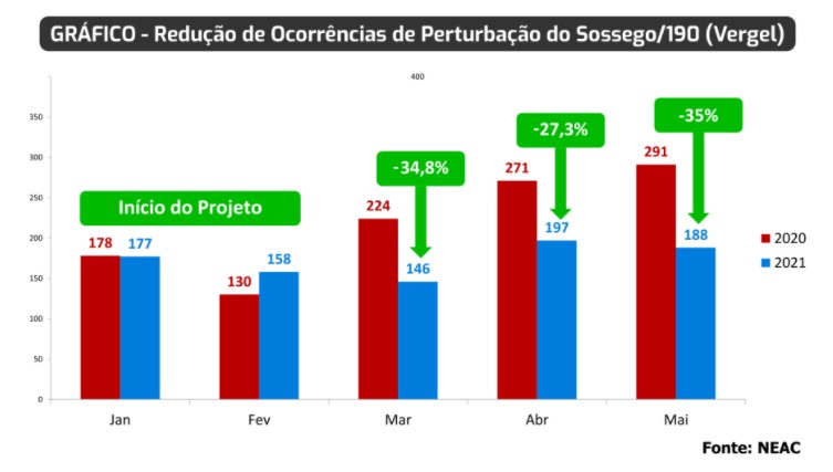 De acordo com dados acompanhados pela SSP, nos meses de março, abril e maio foram registradas quedas de 34,8%, 27,3% e 35%, respectivamente, no número de ocorrências de perturbação do sossego e poluição sonora em comparação com o mesmo período do ano passado.