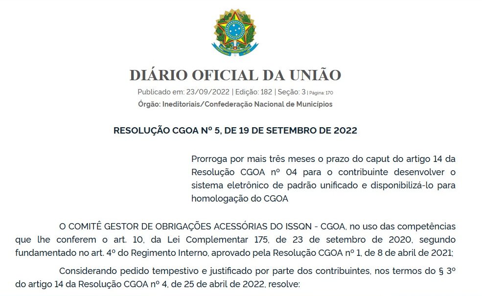 A Resolução CGOA 5/2022 foi publicada no Diário Oficial da União (DOU) de sexta-feira, 23 de setembro, pelo Comitê Gestor das Obrigações Acessórias (CGOA). De acordo com a Resolução 4 do CGOA, o prazo inicial era em 13 de agosto, podendo ser prorrogado por igual período.