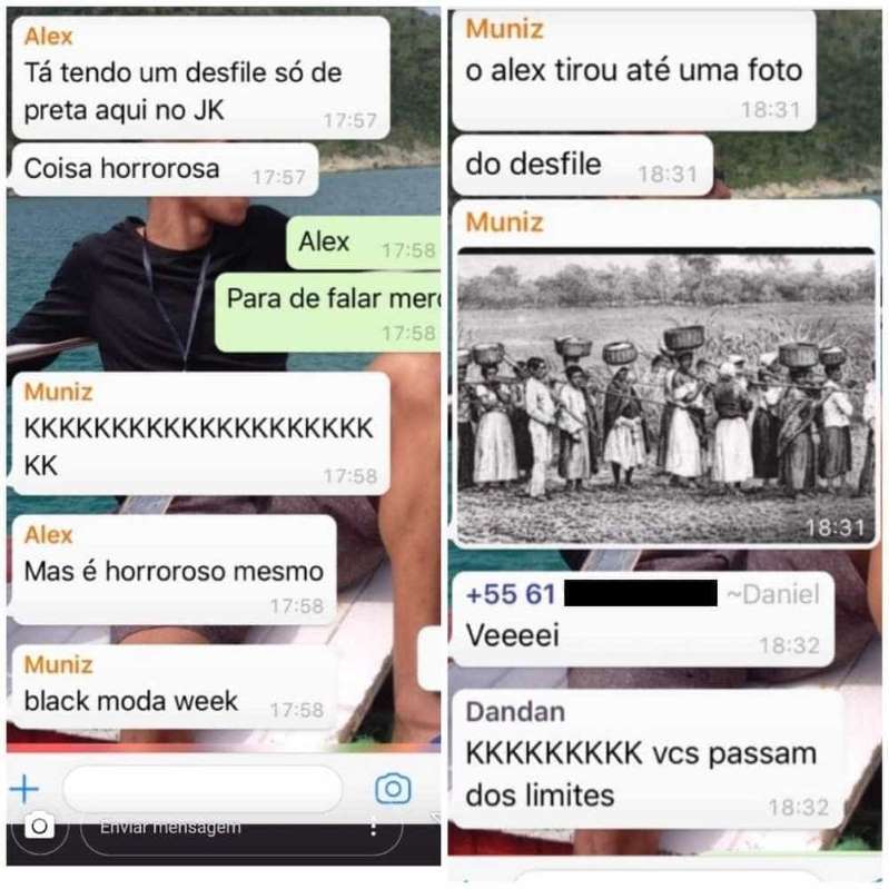 Outro membro do grupo, identificado como Muniz, fala em tom jocoso que Alex tirou uma foto do desfile e encaminha a imagem de escravas enfileiradas, com cestas em cima da cabeça. Um deles contesta a “brincadeira” e um quarto, de apelido Dandan, responde: “Agora o cara é obrigado a achar as preta bonita? [sic]”