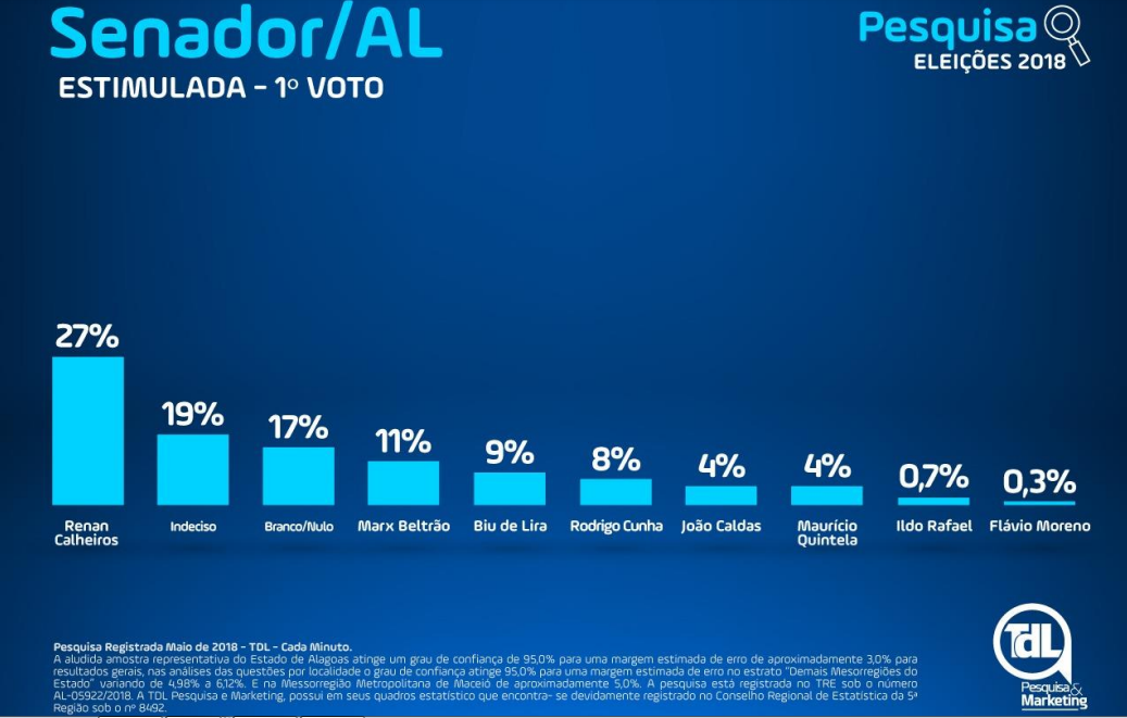 A Pesquisa Foram entrevistados 1.067 eleitores, estratificados segundo gênero, faixa etária, grau de escolaridade, nível econômico e posição geográfica, com base nos dados mais atualizados do PNAD/2014 e TSE/TRE 2018. O levantamento foi feito em 53 municípios, durante os dias 15, 16 e 17 de maio nas 13 mesorregiões de Alagoas.