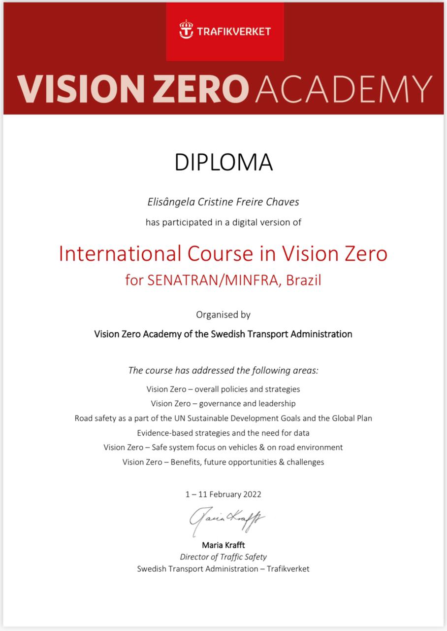 O município participou do Curso Digital Visão Zero, que foi viabilizado pelo Ministério da Infraestrutura, por meio da Secretaria Nacional de Trânsito (Senatran), com o apoio da Embaixada do Reino da Suécia.