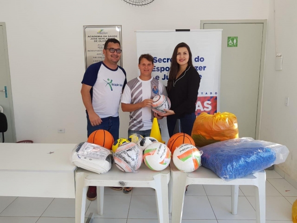 A secretária do Esporte, Lazer e Juventude, Claudia Petuba e o secretário executivo, Charles Hebert, fizeram a entrega do kit com materiais para a prática de modalidades como futebol de campo, futsal, vôlei, basquete e handebol.