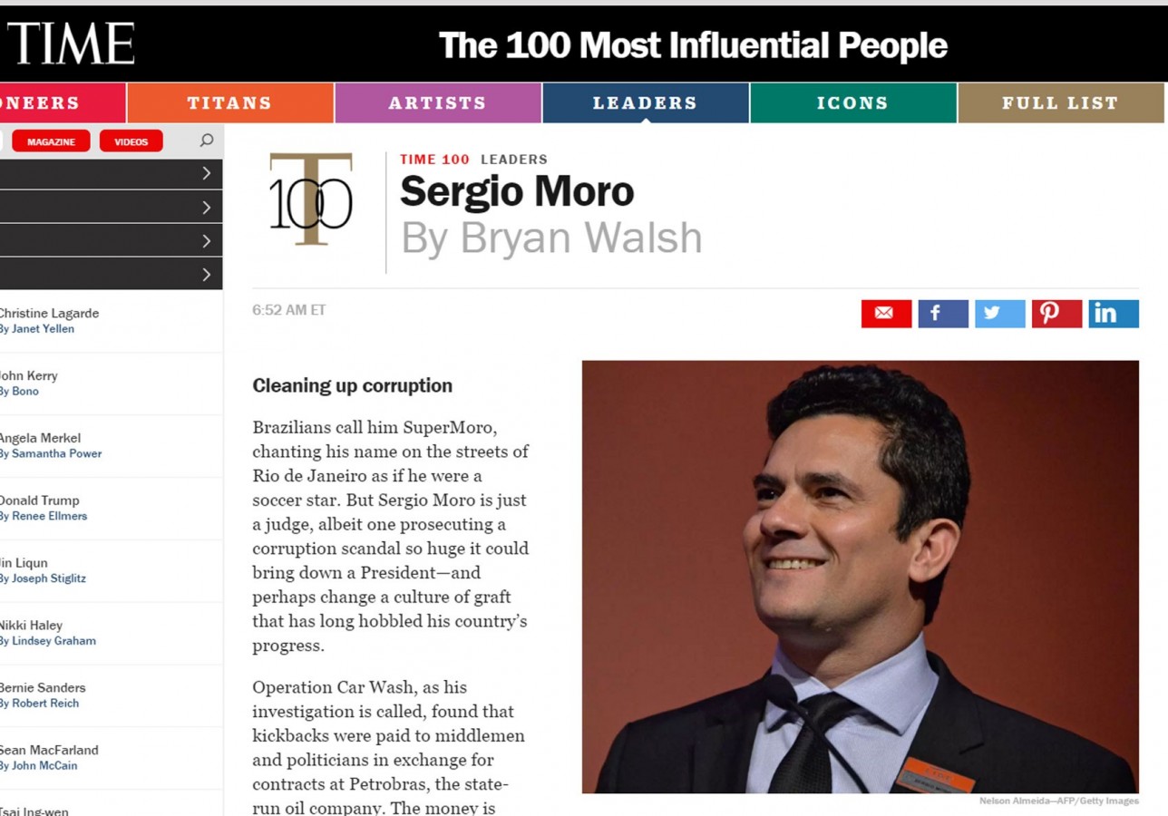“Moro tem sido acusado de ignorar o devido processo legal, e ele tem estado mais do que dispostos a avaliar seus casos no tribunal da opinião pública. Mas a maioria dos brasileiros sente que suas táticas de ‘cotovelos afiados’ valem a pena por um país mais limpo”, prossegue a descrição da “Time”.
