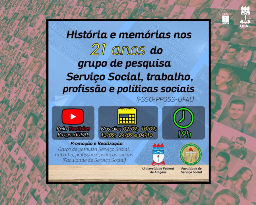 O grupo de pesquisa Serviço Social, Trabalho, Profissão e Políticas Sociais, da Faculdade de Serviço Social, está comemorando 21 anos com a realização do evento História e memórias nos 21 anos do grupo de pesquisa Serviço Social, trabalho, profissão e políticas sociais (FSSO-PPGSS-UFAL).