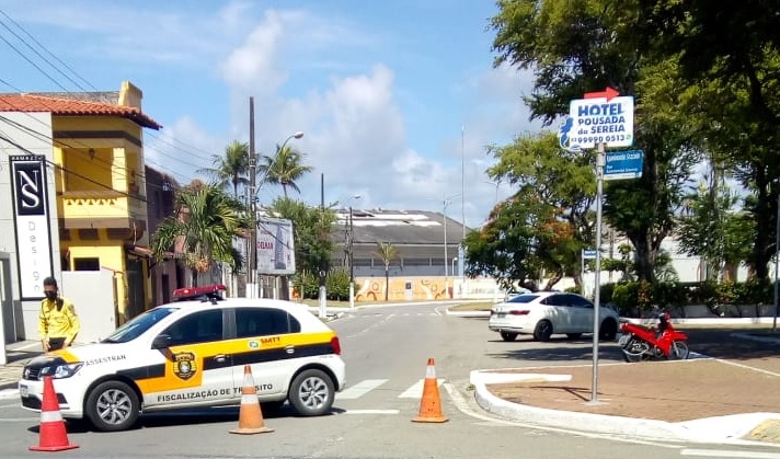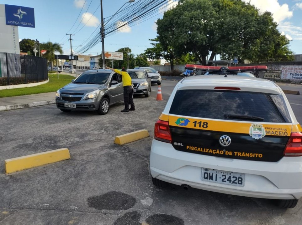 No drive-thru do Estacionamento do Jaraguá, a equipe de fiscalização fez um bloqueio no sentido orla da Pajuçara-Jaraguá, para evitar a ocorrência de fila dupla, uma prática tem sido combatida pelos Agentes de Trânsito que atuam neste ponto.