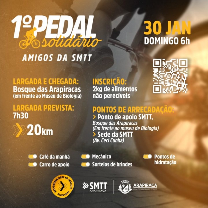 A concentração do pedal será no dia 30 de janeiro em frente ao ponto base da SMTT, no Bosque das Arapiracas, a partir das 6 horas. O percurso do pedal tem 20 quilômetros e vai integrar diversos bairros.