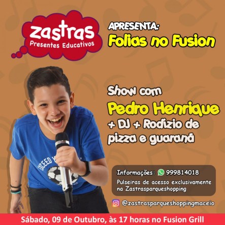 A festa “Folias no Fusion” acontecerá no sábado, 09 de outubro a partir das 17 horas no Fusion Grill restaurante que fica na Ponta Verde e para sua criança participar é só passar na loja Zastras presentes educativos que fica no parque shopping, conhecer sua linha de brinquedos que contribuem para o desenvolvimento infantil e adquirir sua pulseira de acesso que funciona como passaporte da alegria e garante a diversão da garotada com direito a show infantil do Pedro Henrique, Dj, parque infantil e rodízio de pizza com guaraná.