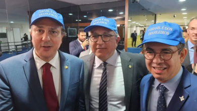 Ministro Padilha usa boné com slogan patriótico no Congresso Nacional em contraponto a símbolo de Trump.