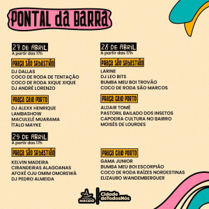 De 27 a 29 de abril, o Festival Abril Pra Cultura chega a seu encerramento, no bairro do Pontal da Barra com uma programação diversa e repleta de talentos locais que se apresentarão nas praças Caio Porto e São Sebastião a partir das 17h.