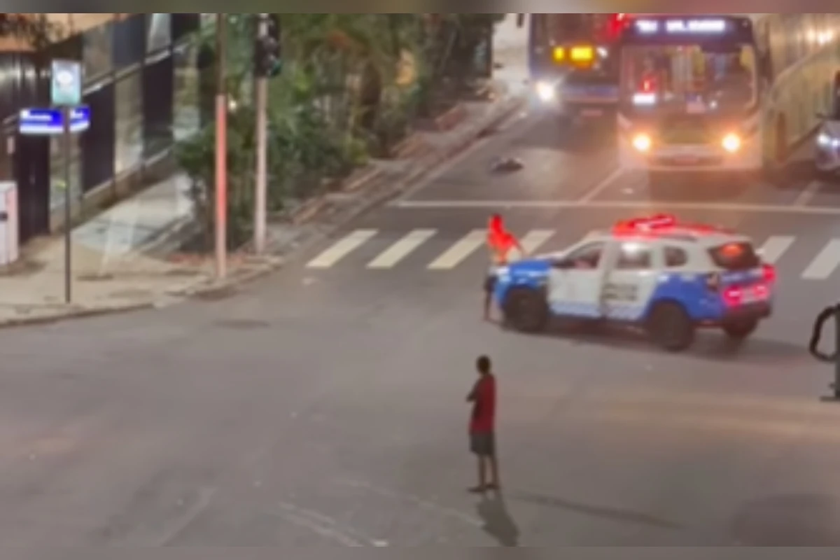 Na sequência do vídeo, após o atropelamento, um policial sai da viatura e parte para cima do homem, que é rapidamente imobilizado no chão. A cena gera uma forte reação nos turistas, que observam os procedimentos da polícia com um misto de fascinação e horror.