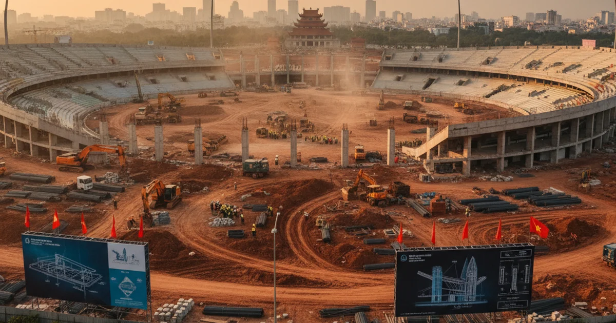 O design do estadio é um ponto destacado, com formas que remetem ao tambor traditional dong son, um símbolo da rica herança cultural vietnamita. As imagens do projeto sugerem não apenas um único estádio, mas a criação de um novo polo esportivo e cultural, com a inclusão de um segundo estádio de grande porte nas proximidades, apontando para um futuro vibrante para a oferta de eventos na região.